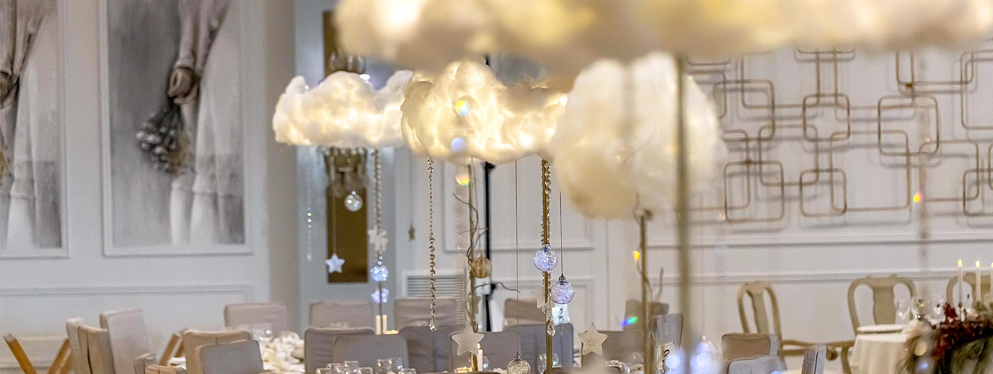 Στο εσωτερικό, η θεματική αποδόθηκε με φωτεινά σύννεφα και αιωρούμενα στοιχεία που έδιναν στον χώρο μια ήρεμη και καθαρή εικόνα. Τα τραπέζια οργανώθηκαν με λευκές επιφάνειες, κρυστάλλινα στοιχεία και λεπτομέρειες σε χρυσό. Οι χριστουγεννιάτικες πινελιές ενσωματώθηκαν με τρόπο διακριτικό, ώστε η συνολική εικόνα να παραμένει ισορροπημένη.
