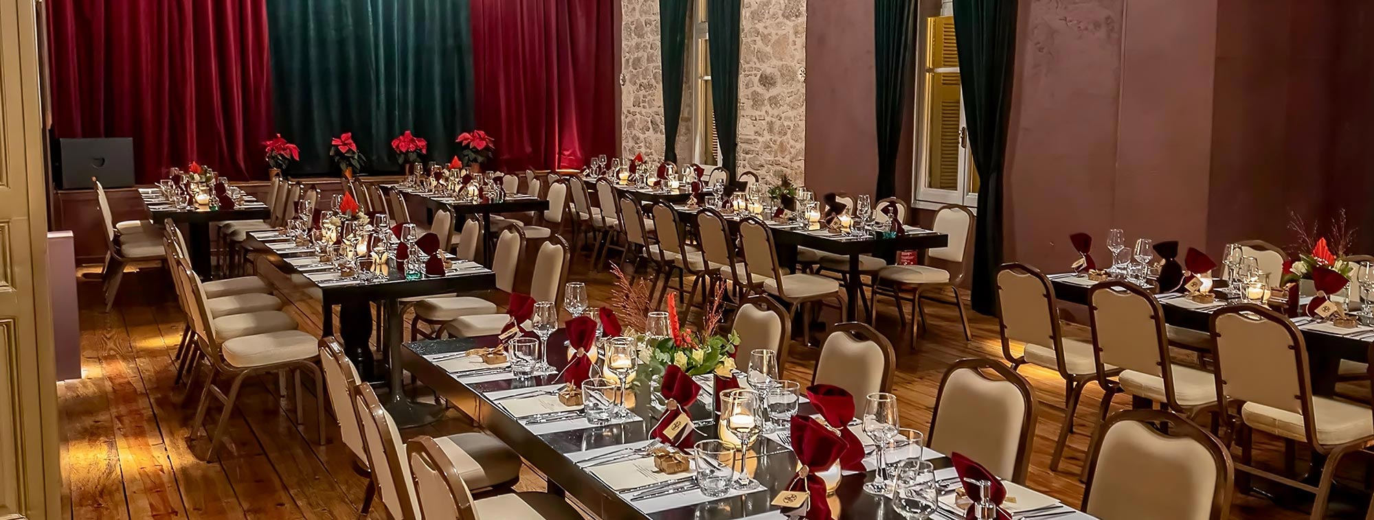 The decoration was meticulously designed to fully respect the institutional nature of the day, while simultaneously highlighting the theater’s atmospheric architecture. Deep burgundy velvet dominated the styling, blending seamlessly with the stone surfaces and the emerald details of the drapery. Warm lighting from classical chandeliers and dozens of candles on the tables created an ambiance of solemnity and nobility.