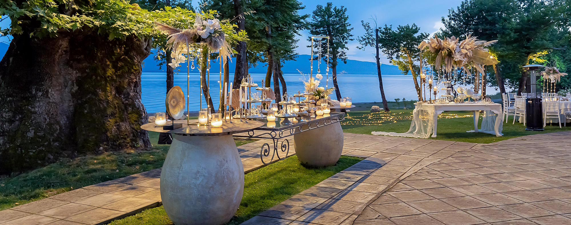 Following the ceremony, the celebration moved to Pythari, a venue inseparably linked to the breathtaking views of Lake Trichonida. The reception on the shores of the lake gave a special character to the evening. The natural landscape of Trichonida, with the water reflecting the event lights, provided a peaceful setting that showcased the environment in the best possible way.